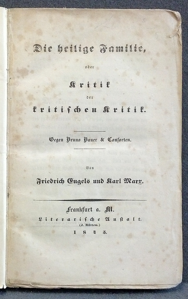 "Die heilige Familie oder Kritik der kritischen Kritik. Gegen Bruno Bauer & Consorten", aus dem Jahr 1845.